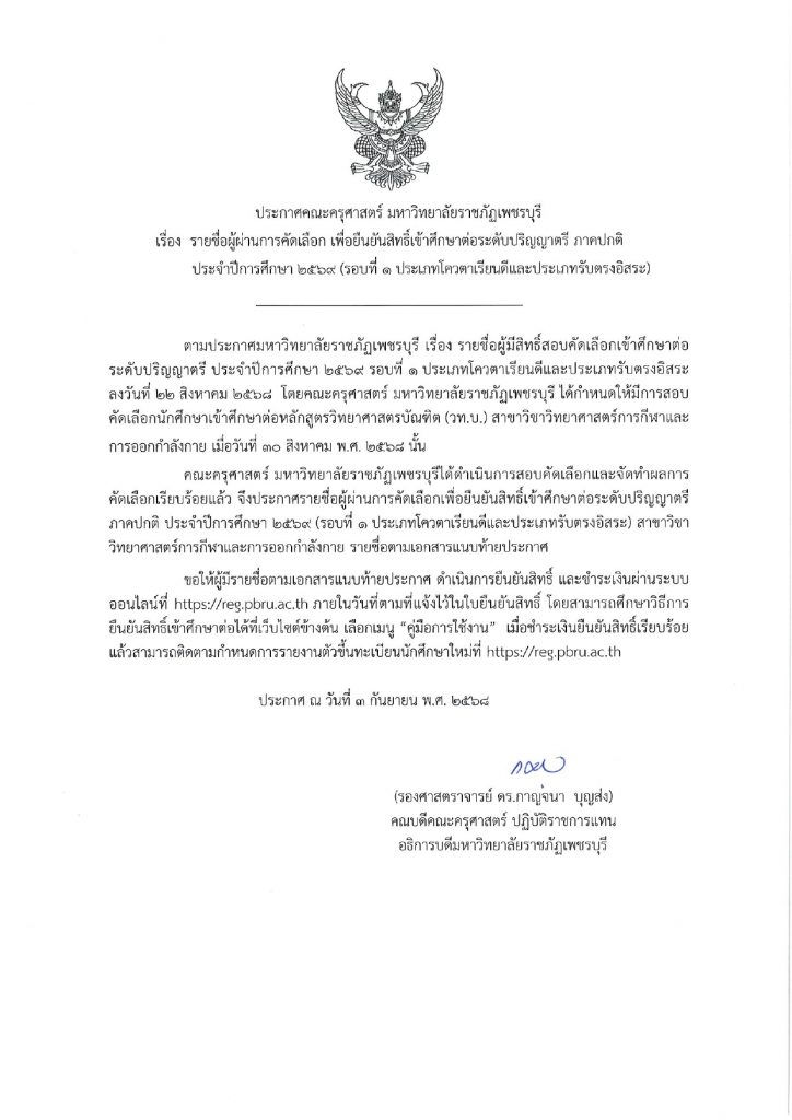 ประกาศรายชื่อผู้ผ่านการคัดเลือก เพื่อยืนยันสิทธิ์เข้าศึกษาต่อระดับปริญญาตรี ภาคปกติ ประจำปีการศึกษา 2569 สาขาวิชาวิทยาศาสตร์การกีฬาและการออกกำลังกาย