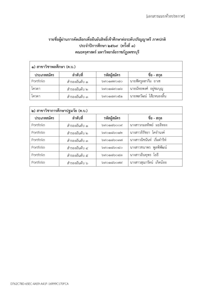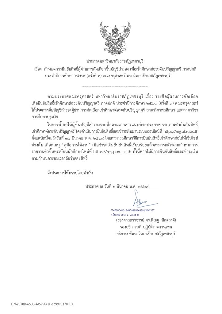 ประกาศกำหนดการยืนยันสิทธิ์ผู้ผ่านการคัดเลือกขึ้นบัญชีสำรอง เพื่อเข้าศึกษาต่อระดับปริญญาตรี