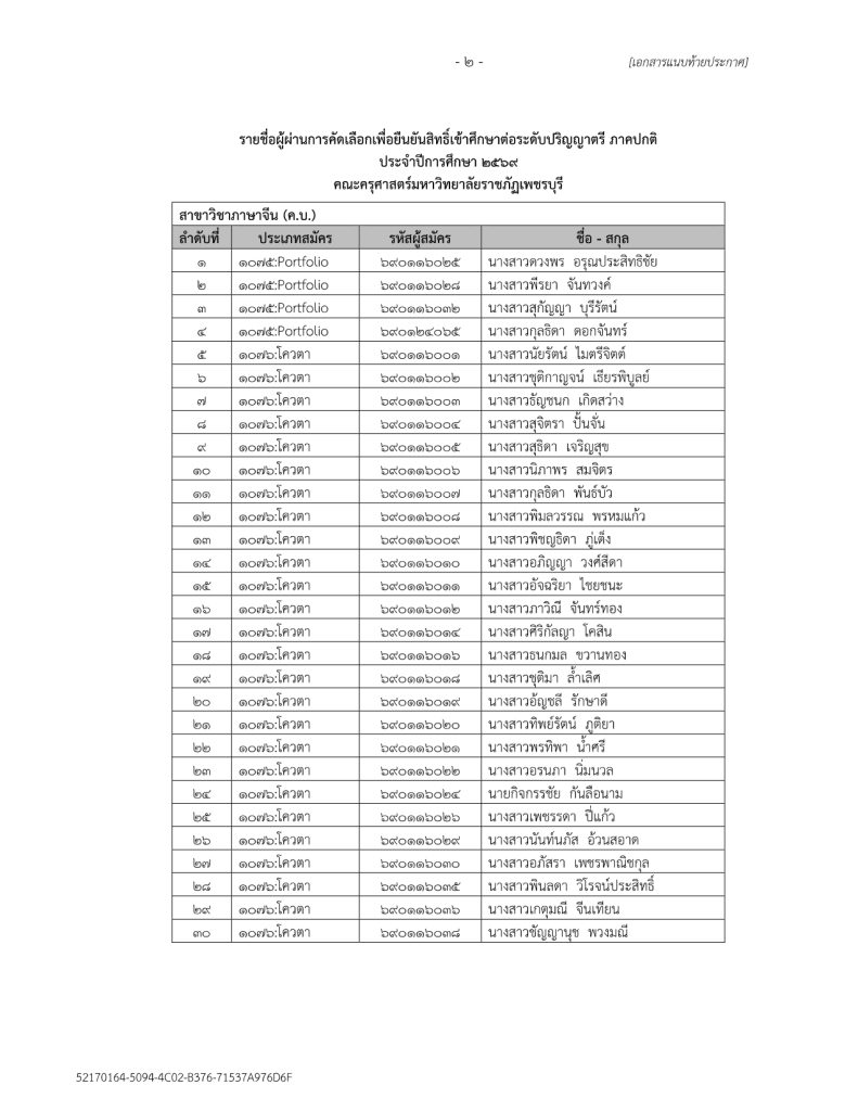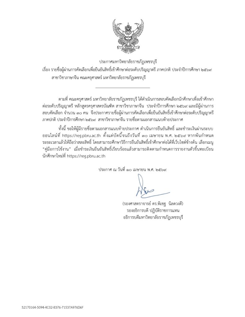 ประกาศรายชื่อผู้ผ่านการคัดเลือกเพื่อยืนยันสิทธิ์เข้าศึกษาต่อ สาขาวิชาภาษาจีน